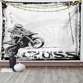 Ambesonneオートバイインテリアコレクション、モトクロスRacerイメージon grungy背景ポスタースタイルMonochromicアートワーク印刷、ベッドルームリビングルーム寮壁吊りタペストリー、60 x 40インチ、ブラックホワイト