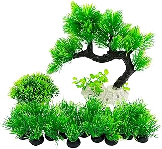 Aquarium Plants Fish Tank Decorations 7.8inch Tall Medium/Large Plastic Artificial Plant Goldfish Waterscape Fish Hides Bonsai/Pine Tree Set (松/水草セット)